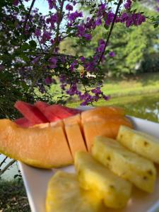 Breakfast served on a covered patio by the duck pond. A 15-minute walk to town center, safe at night. Air conditioning and good wifi in rooms. Kids enjoyed feeding fish and playing on the swing. Several sloths were seen on the property one evening.